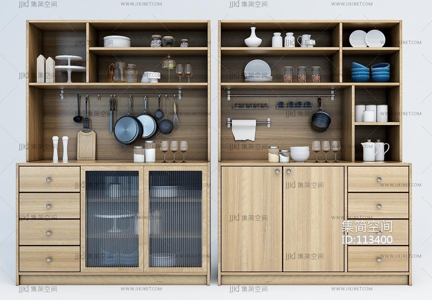 现代厨房柜子、餐具、厨房用具,平底锅, 3d模型下载 [模型ID:113400]