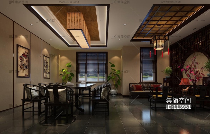 新中式茶室 茶桌 ,藤编编织吊灯,竹竿3d模型下载
