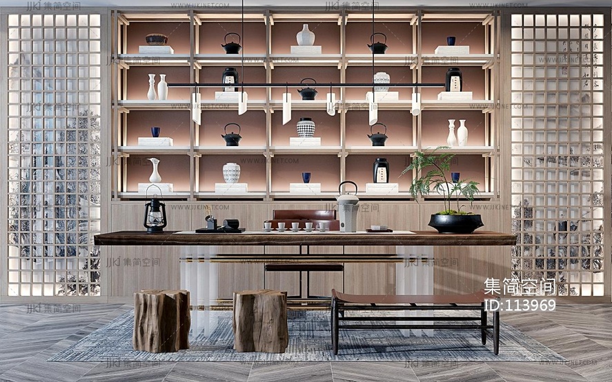 新中式茶室 茶桌 ,藤编编织吊灯,竹竿3d模型下载