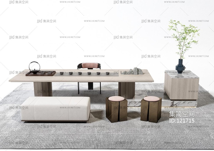 新中式茶桌椅,茶台,木凳子,茶具 3d模型下载 [模型ID:121715]
