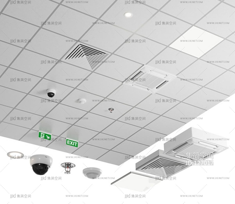现代矿棉板吊顶换气扇空调安全出口摄像头,花洒烟感报警消防设备器材v 3d模型下载 [模型ID:127017]