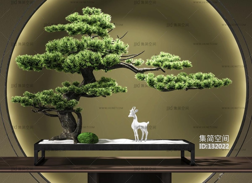 新中式条案摆台,盆景小鹿 3d模型下载 [模型ID:132022]