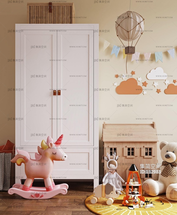 现代儿童玩具,玩具柜,摇椅,云朵热气球墙饰 3d模型下载 [模型ID:132983]