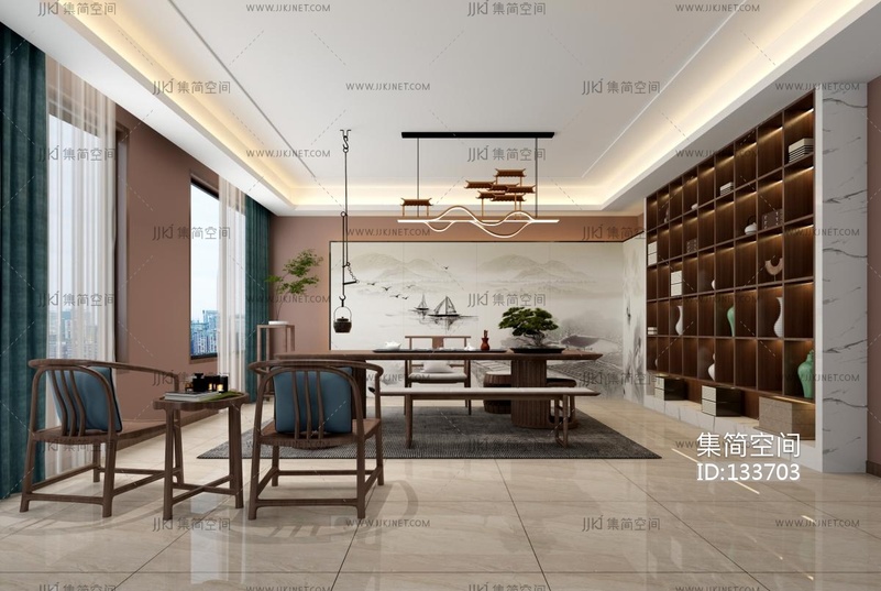 新中式茶室 茶桌 ,藤编编织吊灯,竹竿3d模型下载