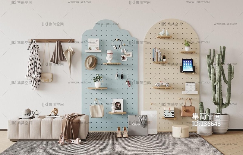 现代儿童洞洞板_置物架挂衣钩,换鞋凳层板摆件 3d模型下载 [模型ID:136643]