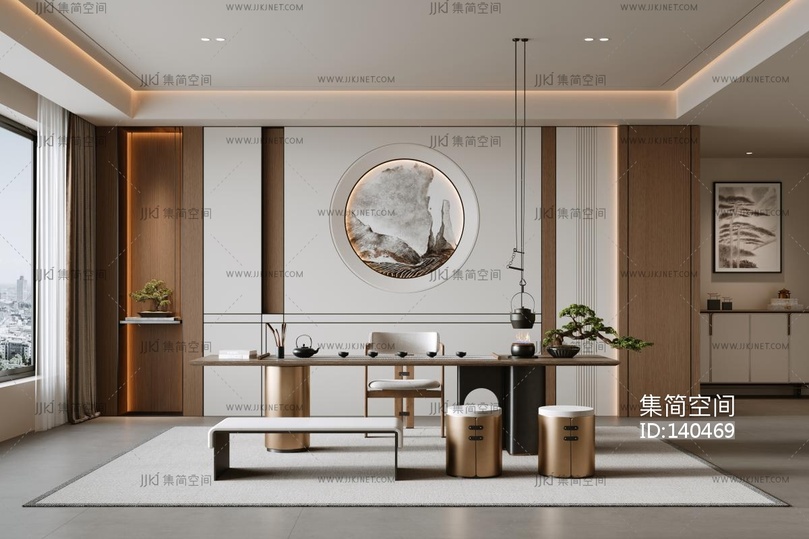 新中式茶室 茶桌 ,藤编编织吊灯,竹竿3d模型下载