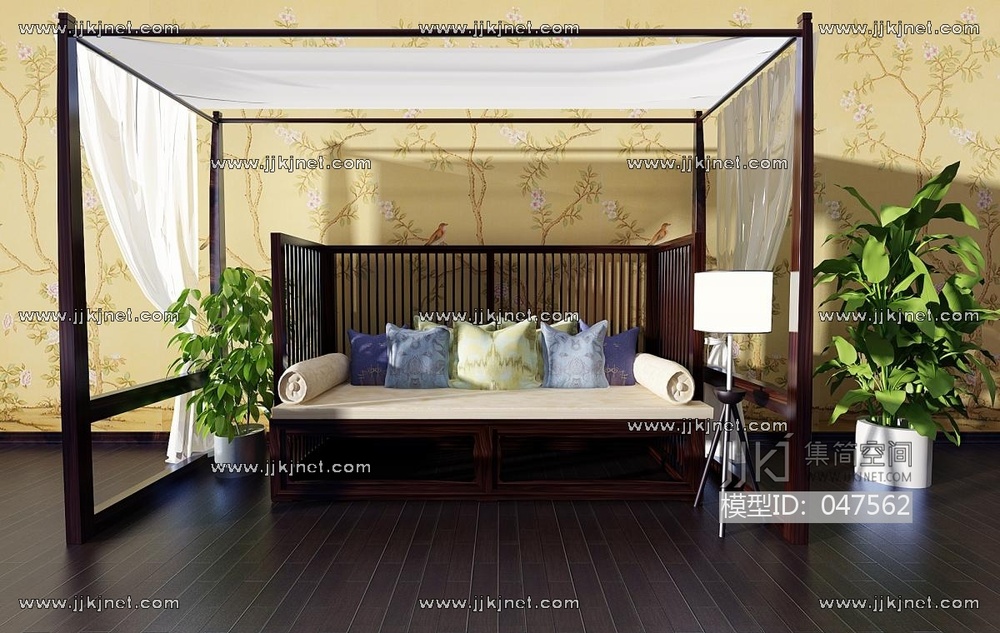 Z27-0619东南亚新中式高背休闲长椅沙发罗汉床纱幔 3d模型下载 [模型ID:47562]