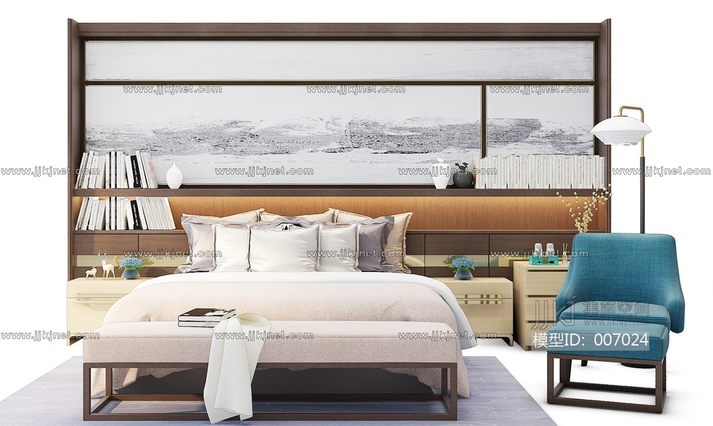 60新中式双人床卧室3d模型下载
