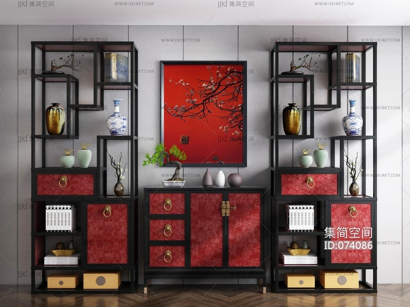 41新中式装饰柜书柜多宝格玄关柜摆件 3d模型下载 [模型ID:74086]