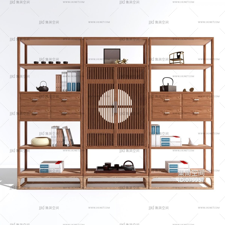 新中式古典实木博古架,书架,摆件 3d模型下载 [模型ID:79957]