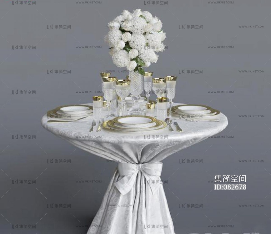 小圆形桌布婚礼婚庆摆台,餐具捧花 3d模型下载 [模型ID:82678]