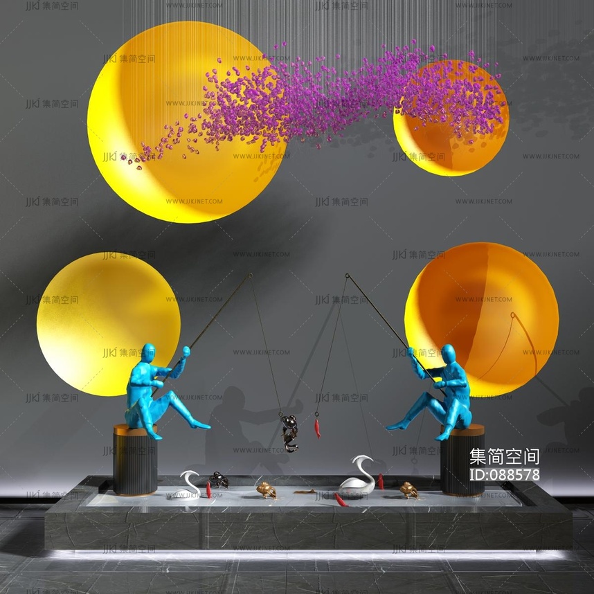 新中式小人钓鱼,雕塑水景,水晶吊灯,景观小景 3d模型下载 [模型ID:88578]