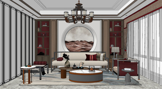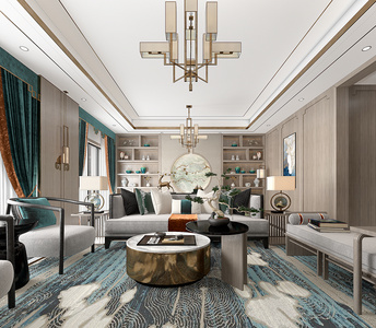 Z37-0731新中式客厅沙发茶几单椅沙发踏书柜吊灯