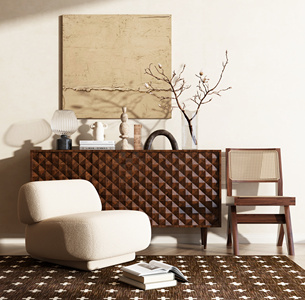 侘寂风边柜,单人休闲沙发藤编椅子饰品摆件