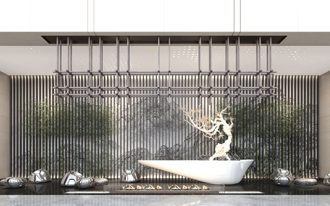 新中式酒店会所景观小品,松树,服务台摆台背景墙