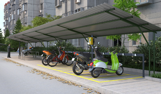 现代彩钢瓦,自行电动车车棚,遮阳棚,树叶