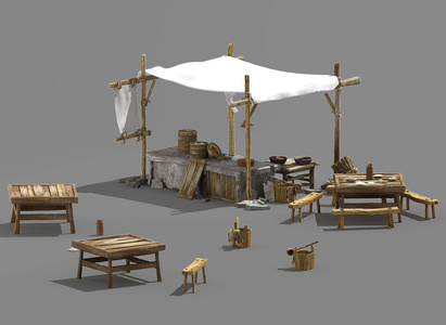 中式古代外摆摊位,,帐篷遮阳伞木头劈柴,柴火,柴火堆,
