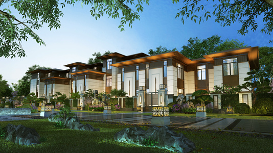 中式园林别墅夜景建筑外观