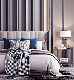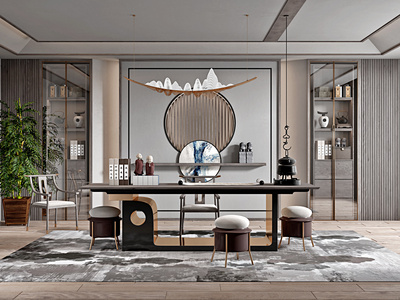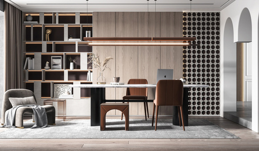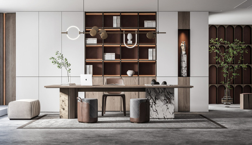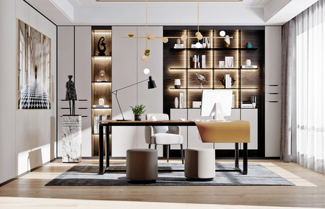 现代轻奢书房,书桌椅,书柜,台灯显示器