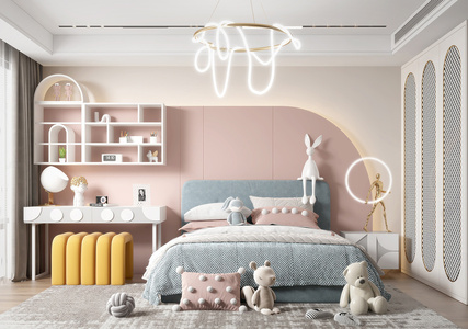 SY03-现代儿童房,女孩房,女儿房卧室,管形吊灯,玩偶,摆件,梳妆台