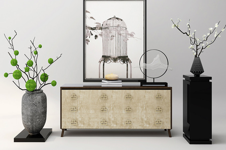 13-现代中式玄关柜陶罐干枝植物