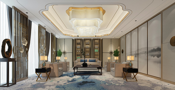 H08-0318新中式会所接待室会客厅沙发大型水晶吸顶灯书柜
