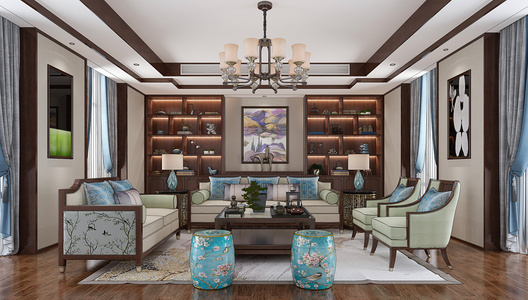 H15-0318新中式会客厅沙发茶几鼓凳书柜