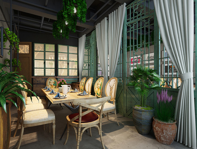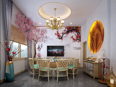134-1022中式民宿民宿餐厅包房包房藤椅编织椅子鸟笼灯