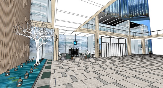 新中式办公酒店会所大堂大厅,荷花池水景,干枝-