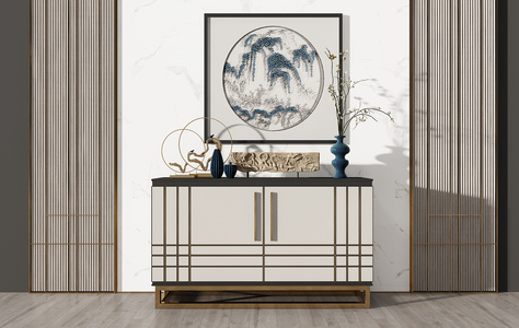 Z30-0704新中式现代边柜玄关柜摆台木雕挂画摆件