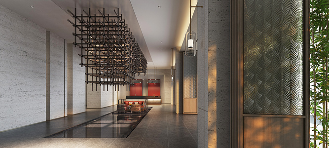 新中式酒店大堂,前厅接待台