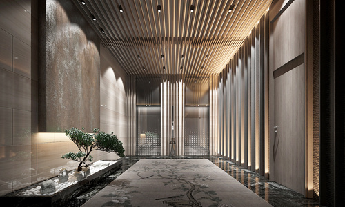 16-12-04新中式酒店大堂,前厅接待台,屏风,吊饰,服务台水景