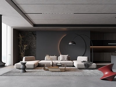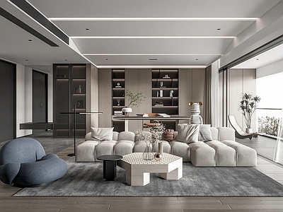 现代大平层客厅_沙发茶几组合_书桌椅_雕塑摆件_绿植盆栽_书柜