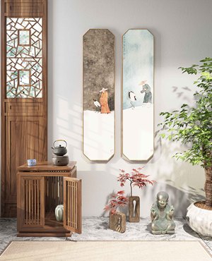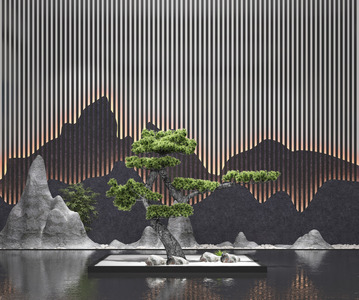 新中式迎客松,石头山脉造型格栅,景观背景墙松树水景