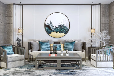 192新中式沙发茶几组合,水墨山水画中式背景墙,格栅,吊灯,单人椅,摆件组合,抱枕靠垫