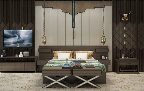 H02-0114新中式蒙古床花格羊头挂饰电视柜
