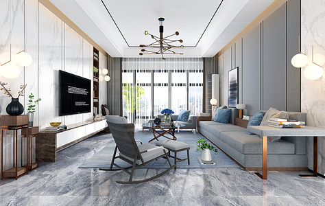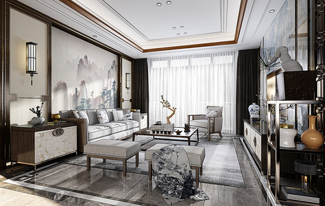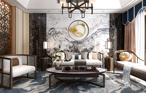 H08-0115新中式客厅沙发茶几窗帘躺椅摆件