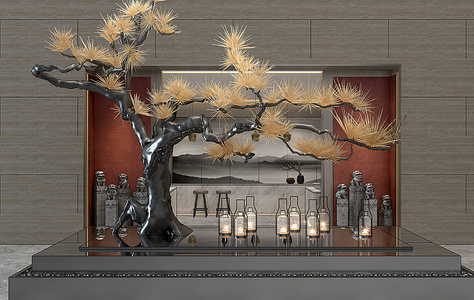 H06-0112新中式大堂水景造型景观松树落地灯石狮子迎客松