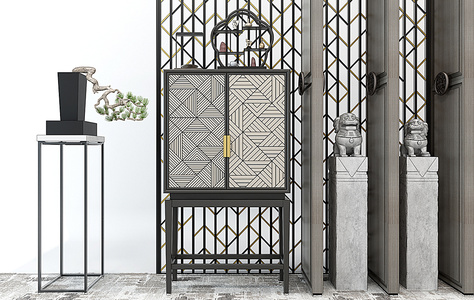 H16-0105新中式边柜玄关柜花架盆景狮子