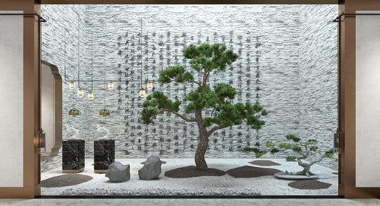 01中式景观天井松树石头摆件吊灯枯山水中式造景