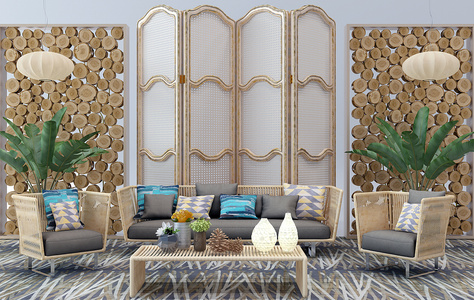 H54-1213东南亚藤编沙发茶几屏风木桩组合