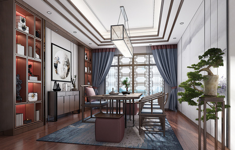H11-1221新中式禅意茶室中式书柜书桌盆景吊灯