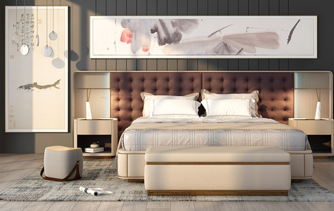 Z10-0301新中式现代双人床床头柜吊灯墙饰挂件蜻蜓挂件摆件组合副本