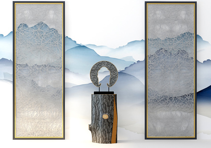 Z22-0301新中式摆件饰品隔断木桩墩远山背景画组合副本