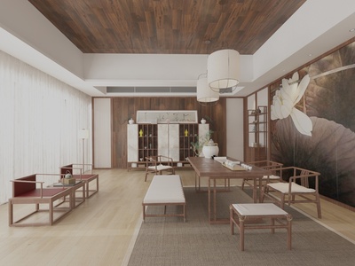 新中式茶室书房,茶桌椅,书柜,花架,蝴蝶兰