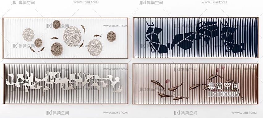 现代新中式鱼群,小鱼荷花抽象装饰挂画 3d模型下载 [模型ID:100885]