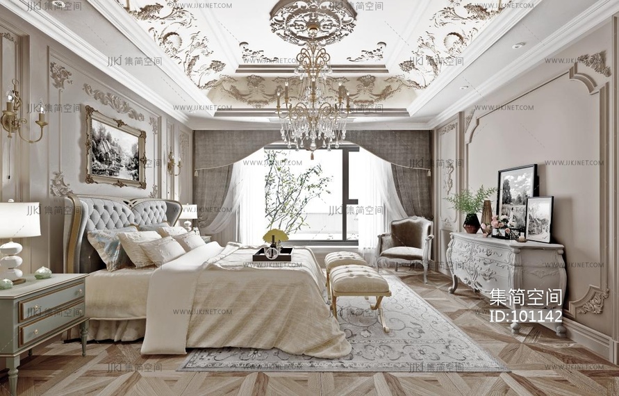 法式古典雕花轻奢卧室主人房 3d模型下载 [模型ID:101142]