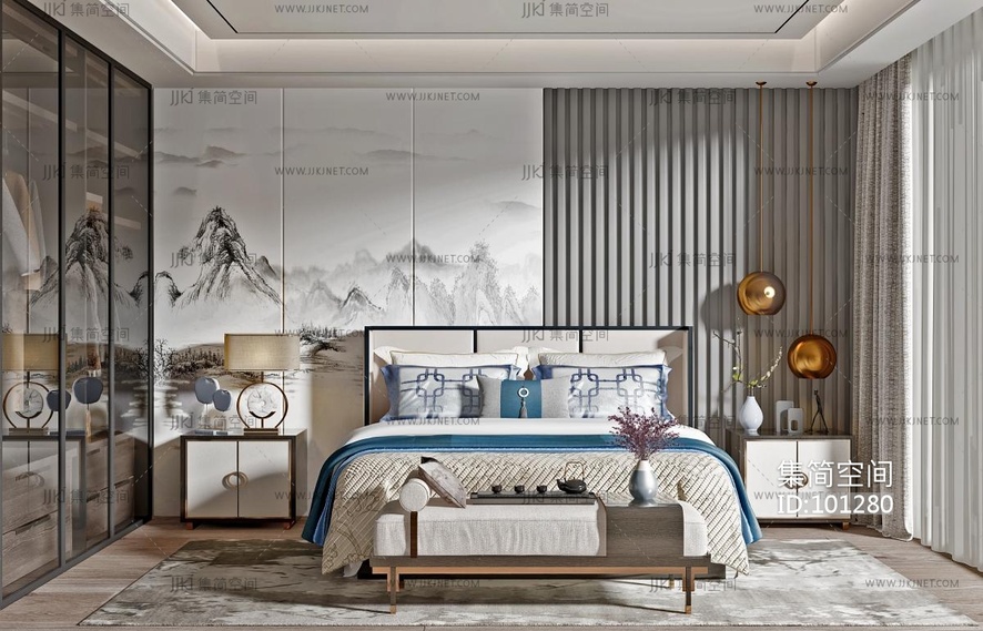 现代 卧室 双人床,床头柜,台灯玻璃衣柜3d模型下载