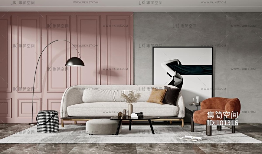 中古风客厅,美式客厅,圆形茶几,装饰画,移动电视,3d模型下载