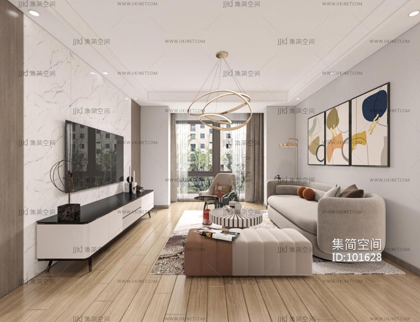 中古风客厅,美式客厅,圆形茶几,装饰画,移动电视,3d模型下载